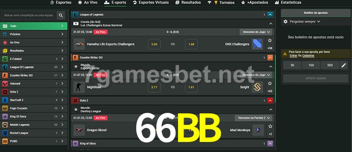 O 66BB oferece uma grande seleção de opções de apostas em e-sports com probabilidades competitivas